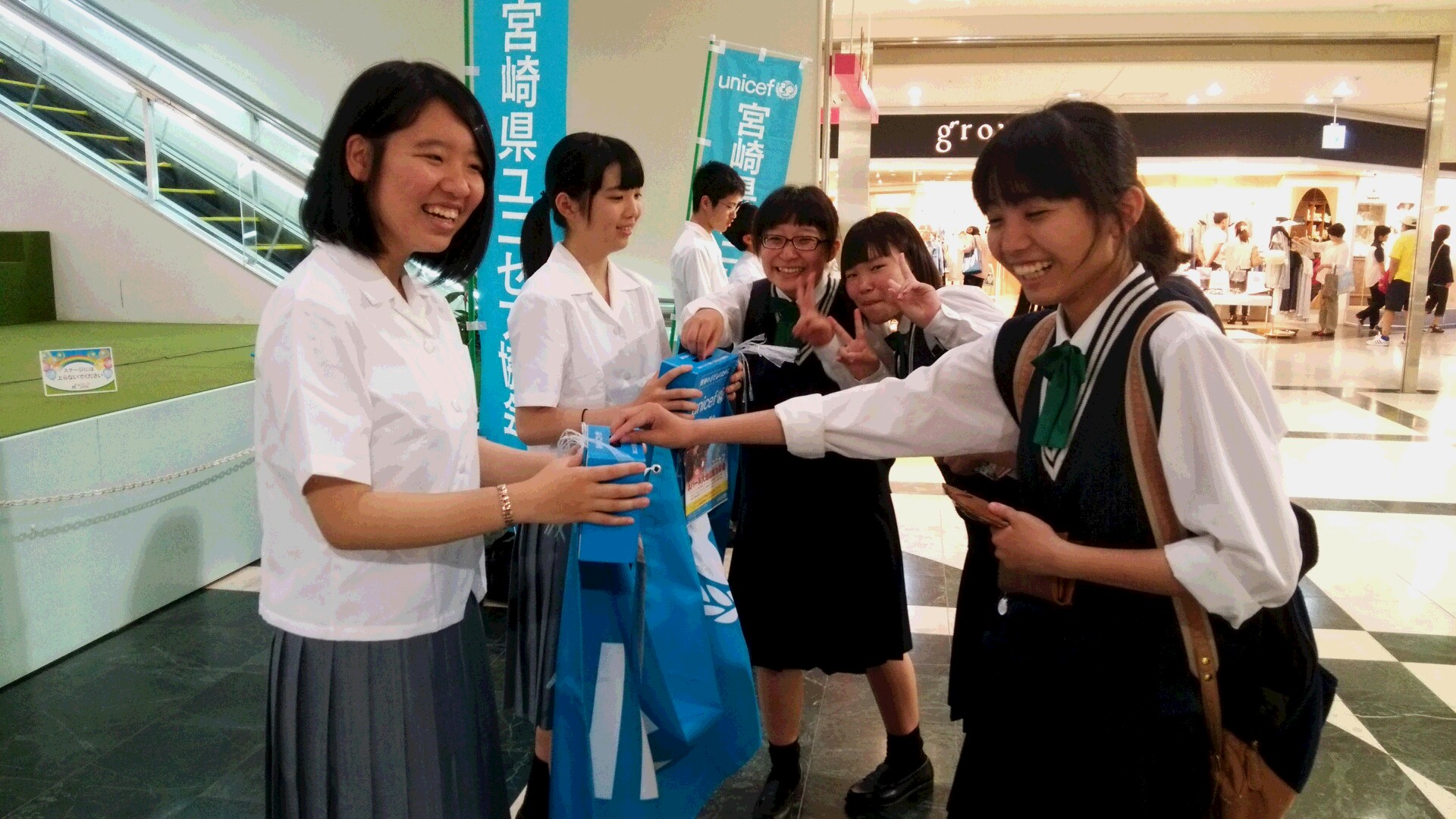 朝の10時から午後3時まで、高校生と宮崎県ユニセフ協会のボランティアの皆さんで、募金を呼びかけました。10個の募金箱の重みがずっしり、疲れも吹き飛ぶほどでした。
