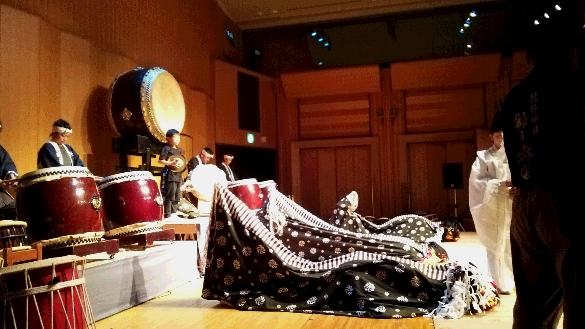 いよいよ和太鼓の演奏開始です。熊野神社から縁起のいい獅子舞を呼んで、和太鼓とのコラボ演奏で始まりました。