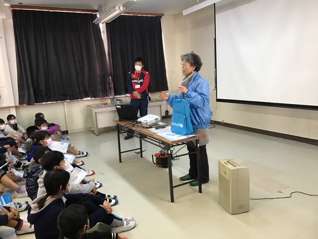 いくつかの支援物資を見てもらった後は、DVD[ユニセフと地球のともだち」を視聴しました。