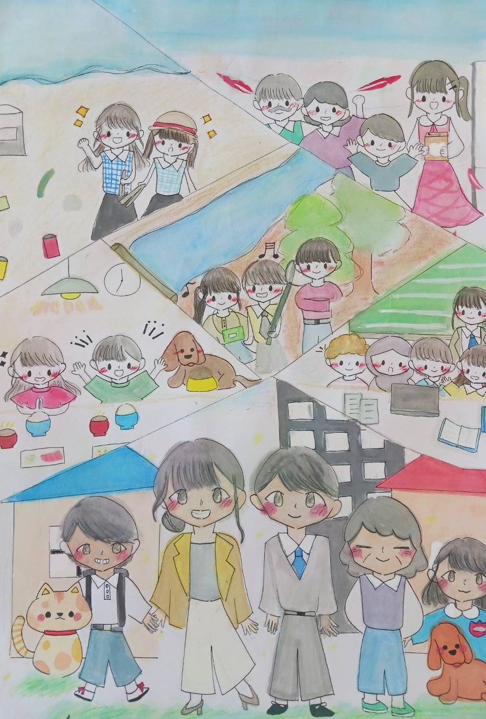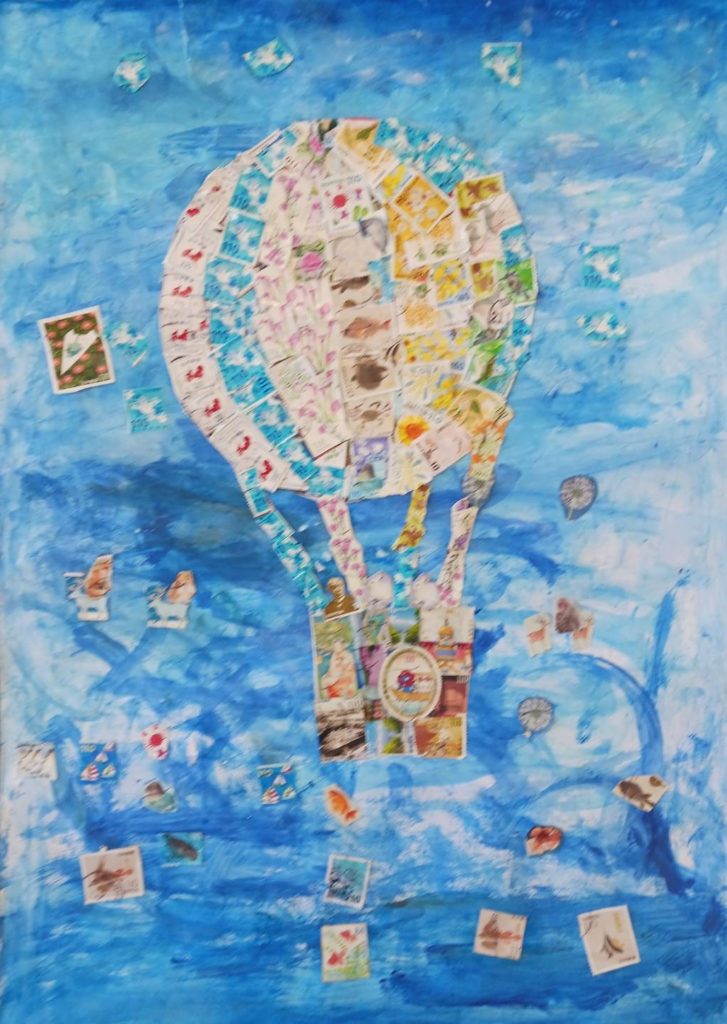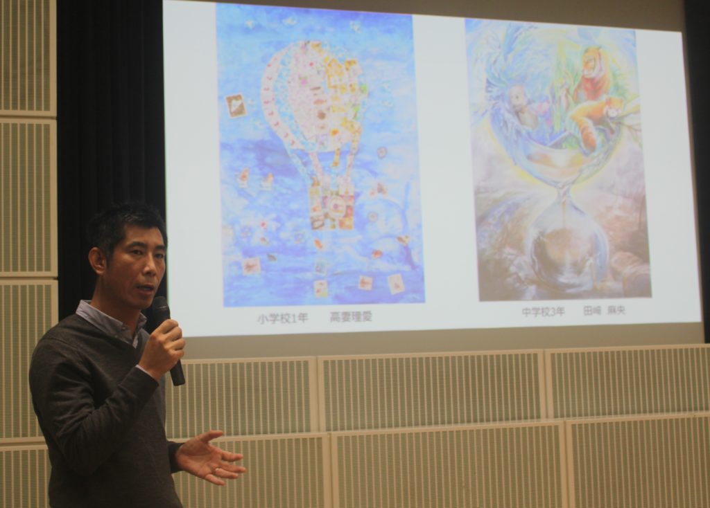 表彰式では、審査員の五十川先生から、3つの観点〇構図構成〇作品の完成度〇どのようなメッセージが込められているか について二つの作品を紹介しながら、具体的に説明がありました。〇中心に球体を描き、迫力がある 〇立体感があり、表現が隅々までいきわたっている 〇切手を使った表現で、切手に「人と人をつなぐ」「未来につなぐ」「ものを生かす」「大切にする」というメッセージが伝わってくる。この3つの観点は今後作品を制作するうえで、大きなアドバイスになったことと思います。「全体的に色鮮やかでレベルの高い作品が多かった。」とご講評をいただきました。