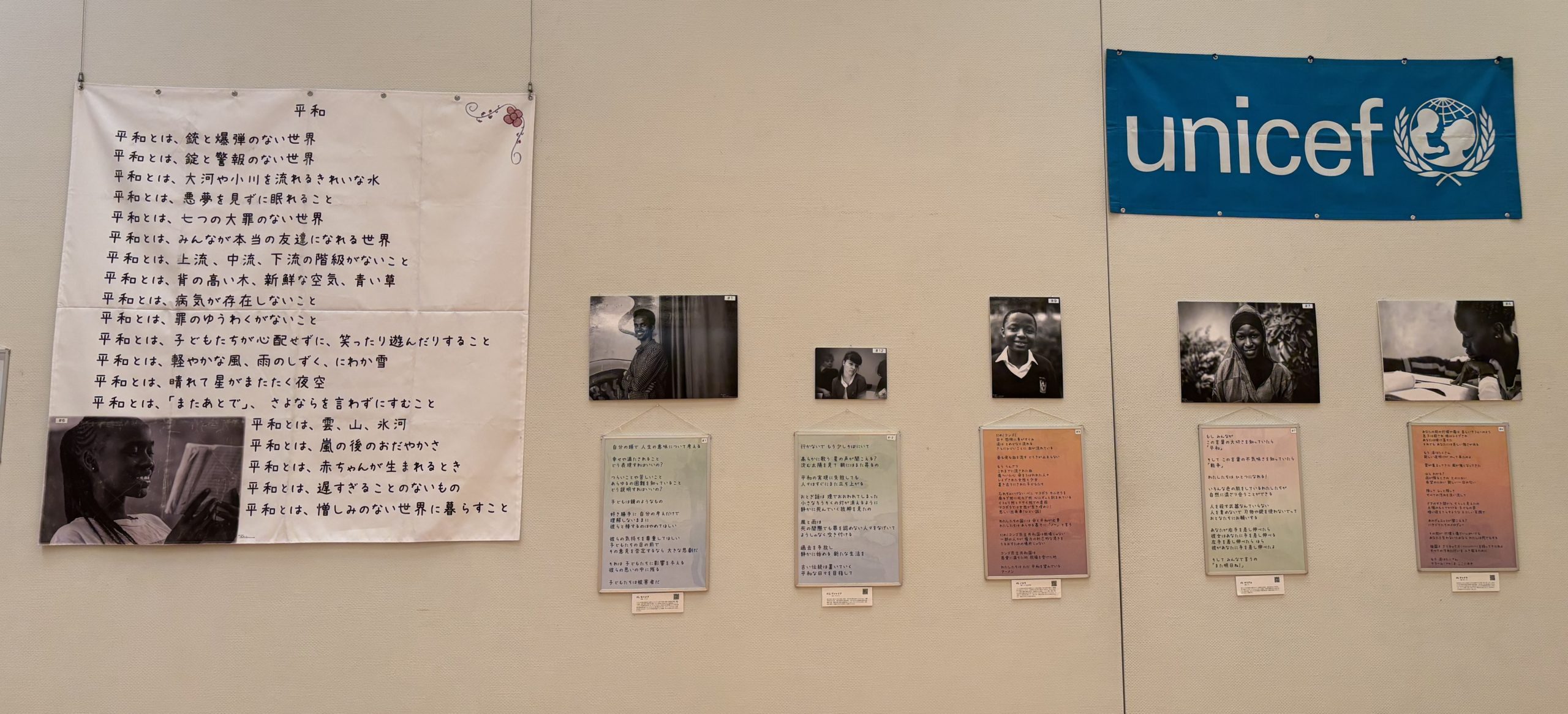 「紛争に奪われた“子どもらしくいられる日常“」「Poems for Peace~平和の詩~」紛争下の子どもたちが綴る平和への思い を展示し、紛争や戦闘が子どもたちの生活に与える影響について、暴力や破壊への深い悲しみ、平穏な未来を望む強い意志がこめられた作品を紹介しました。
