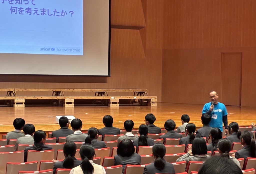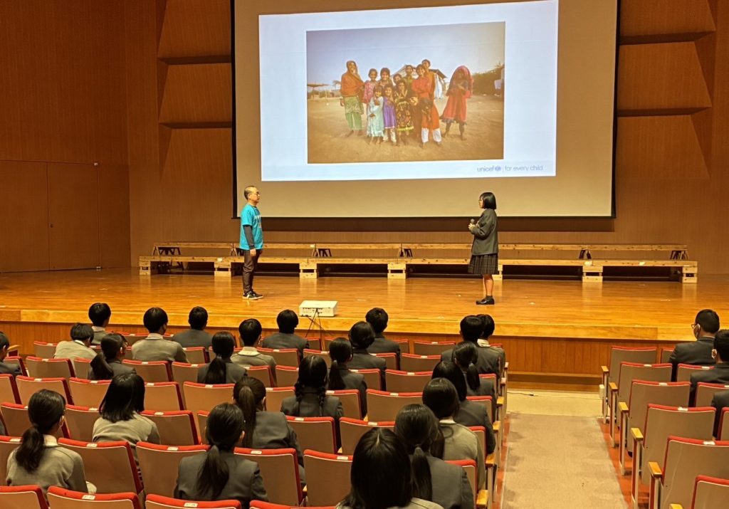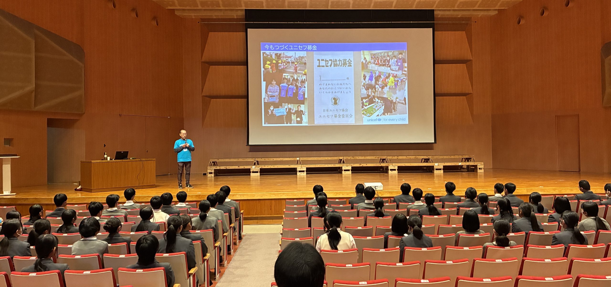 【日時】11月21日(金)15:20~16:05 【場所】大坪記念ホール 【テーマ】ユニセフと世界の子どもたち ユニセフを通して生き方を考える【目的】世界で起こっている様々な問題とユニセフの活動について知り、将来に向けて今自分にできることについて考える