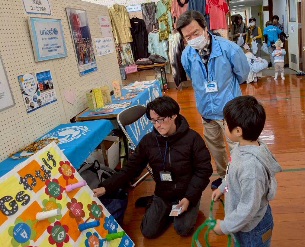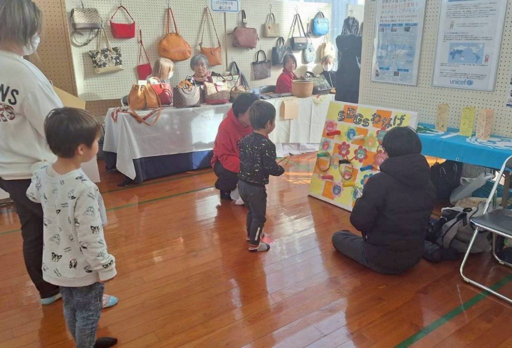【内 容】ホールでは展示とSDGs輪投ゲーム行いました。輪投げに挑戦して、入った番号のSDGsの項目について一緒に考えました。ステージ発表では、宮崎県ユニセフ協会のバンド「おりいぶ」が、世界の平和を祈る曲「チキチータ」「イマジン」「花は咲く」の三曲を演奏し、県協会の活動を紹介しました。キッズからシニアの方まで、いろいろな世代の方の活動を知り、個性が彩られた一日でした。