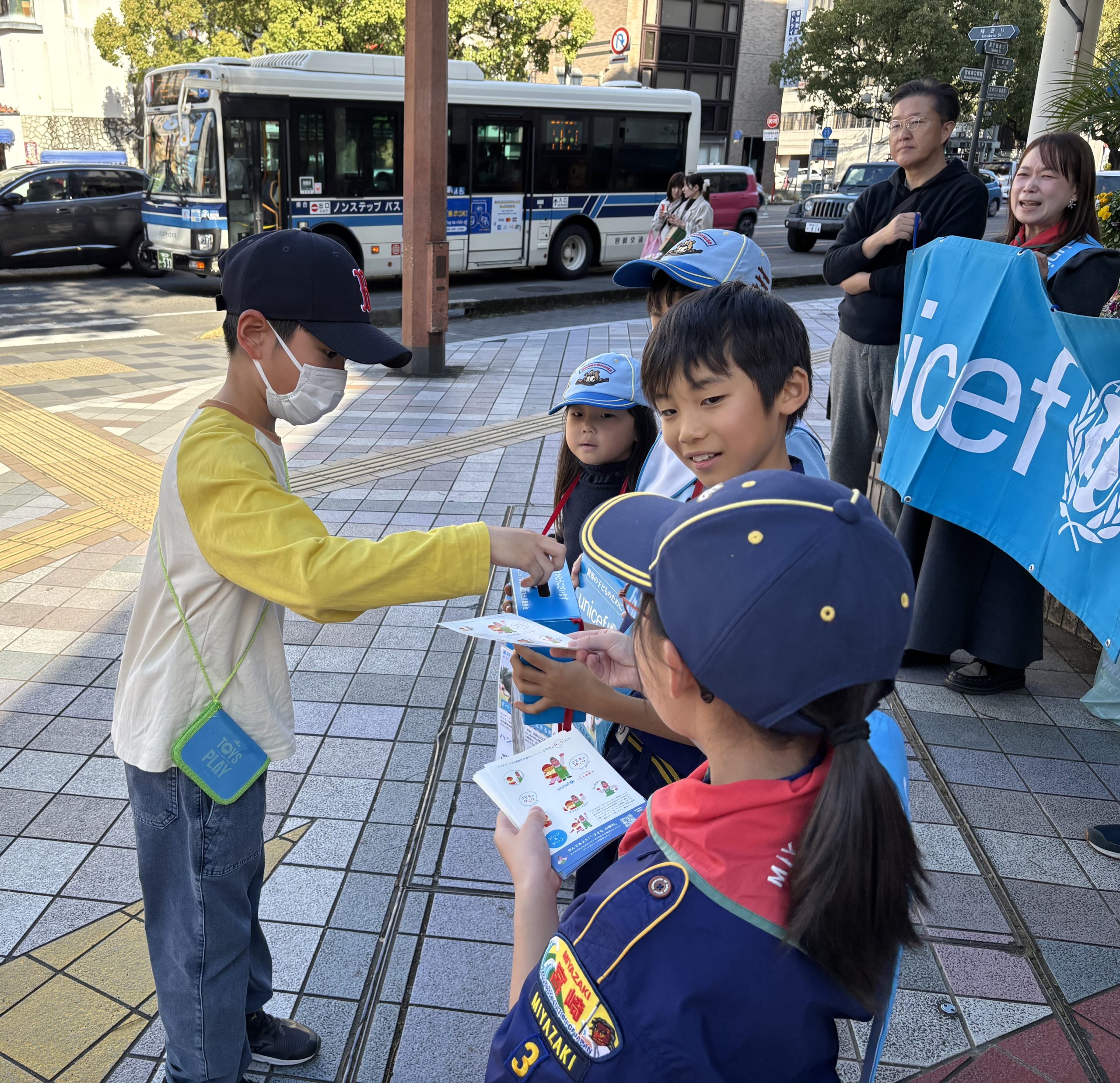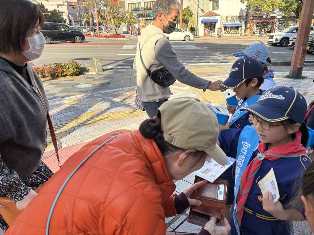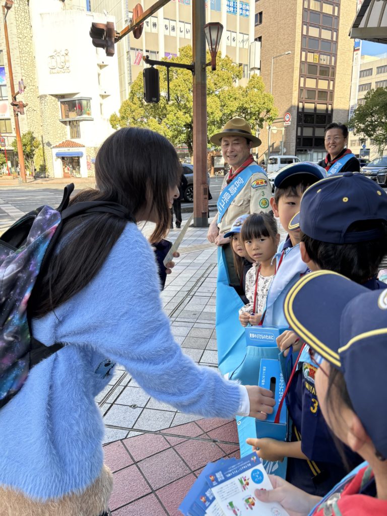 ボーイスカウト宮崎第3団のカブ隊ビーバー隊9名、リーダー4名、と保護者の皆様のご協力でハンド・イン・ハンド募金活動を行いました。募金活動前に、別府街区公園で「世界の子どもたちは、どのような大変な状況の中で生きているの?」「今日の募金活動がどのように役立てられるの?」についてお話ししました。その後どんなふうに声掛けすればよいか考え、実際に練習して、活動場所に移動しました。